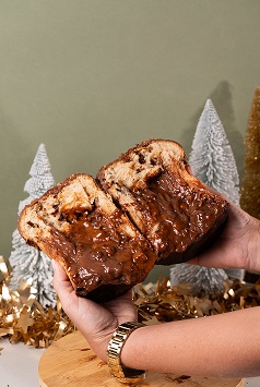 Chocotone com Caramelo Salgado, Castanha caramelizada e Chocolate meio amargo.