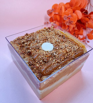 Camadas de doce de leite crocante combinadas com um mousse de doce de leite super cremoso, finalizadas com castanhas caramelizadas e caramelo com flor de sal.